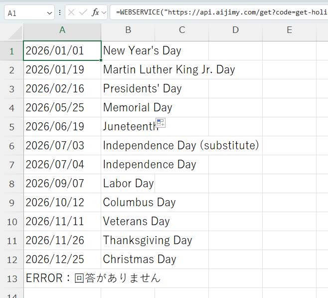 以下にExcel関数で祝日一覧を取得する方法を記載します。